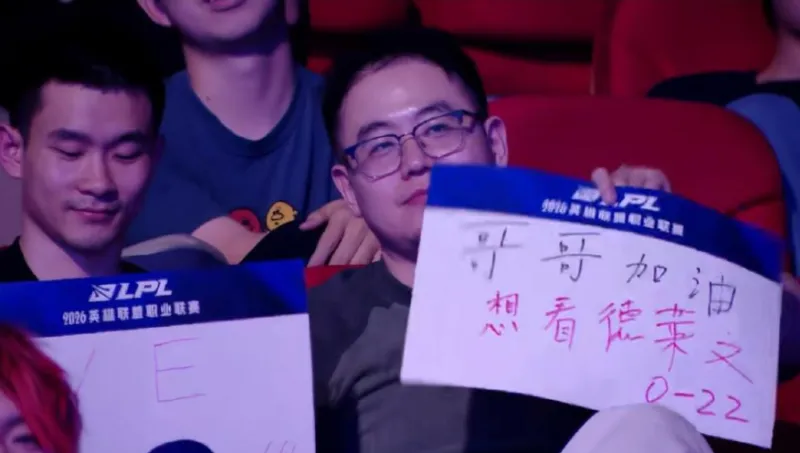 在今天TES对战WE的比赛里,导播给到观众席应援镜头,展示了0-22的应援牌。